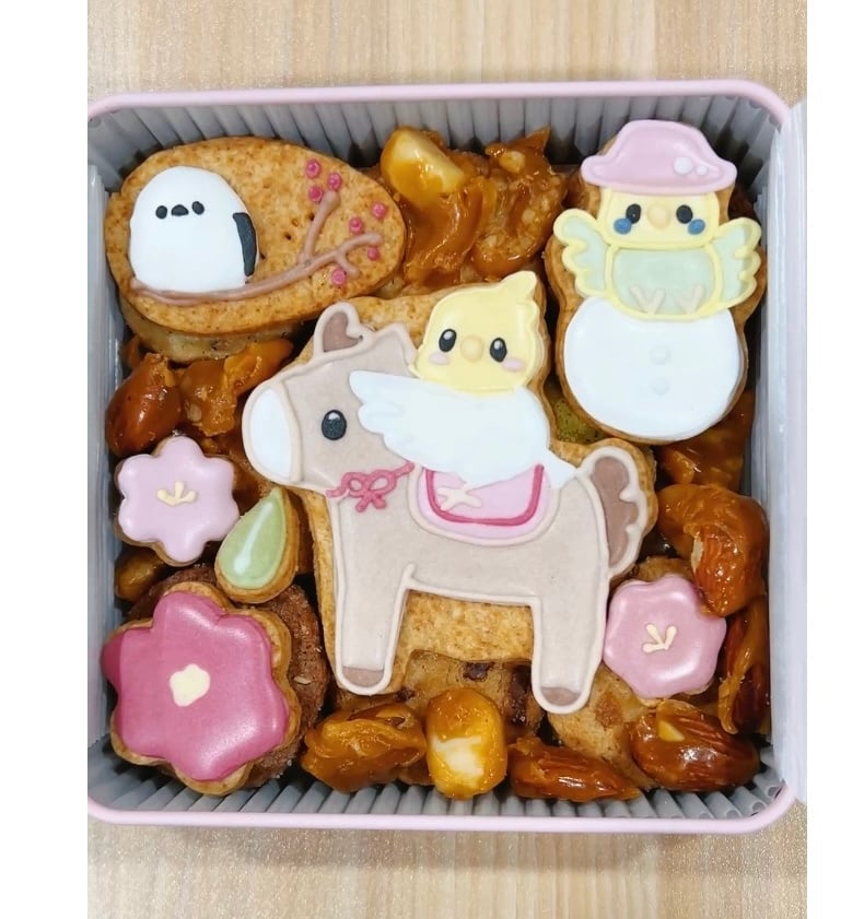 小麦粉、バター(北海道産)、グラニュー糖、オレンジ、アーモンド、牛乳、塩、卵、チョコレート、くるみ、カシューナッツ、マカダミアナッツ、コーヒー、紅茶、オリゴ糖、コーンスターチ、天然色素(竹炭、にんじん、かぼちゃ、ほうれん草、ビーツ)など